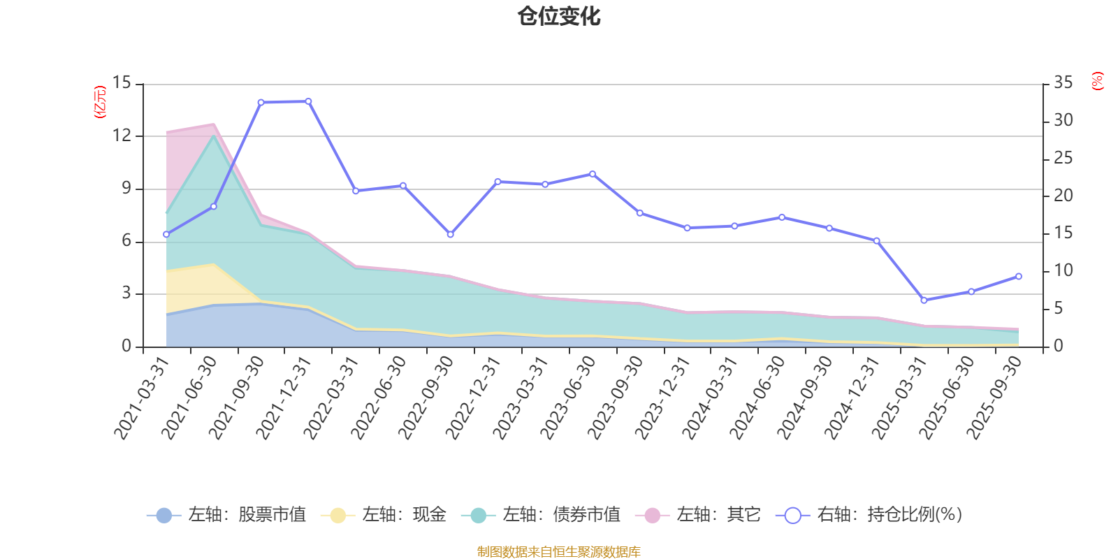 据定期报告数据统计,近三年平均股票仓位为15.54%,同类平均为19.14%。2021年末基金达到32.68%的最高仓位,2025年一季度末最低,为6.2%。