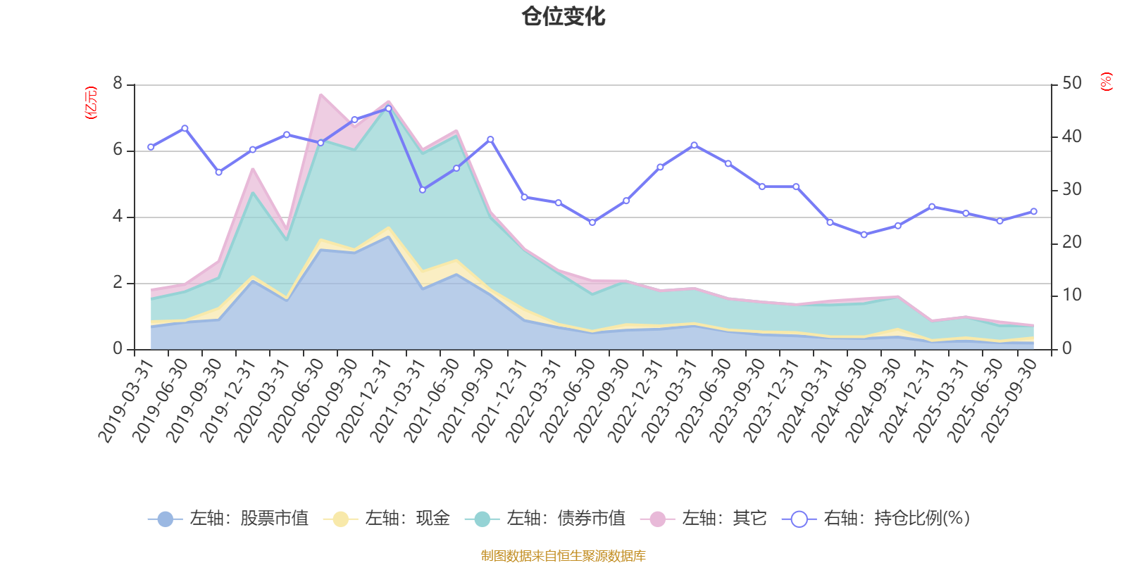 据定期报告数据统计,近三年平均股票仓位为28.45%,同类平均为67.37%。2020年末基金达到45.46%的最高仓位,2024年上半年末最低,为21.66%。
