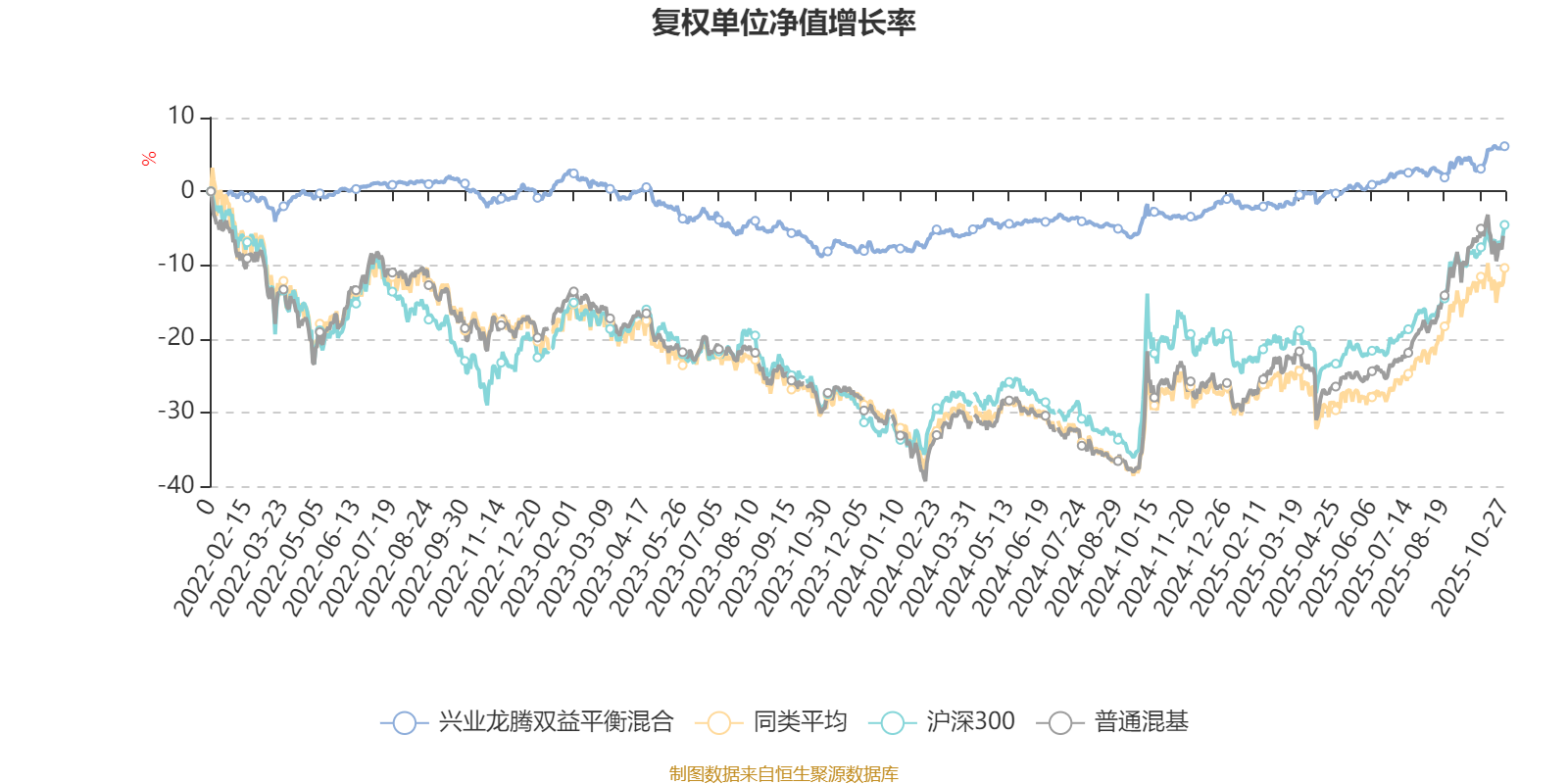 截至10月27日,兴业龙腾双益平衡混合近三个月复权单位净值增长率为3.17%,位于同类可比基金114/134;近半年复权单位净值增长率为6.41%,位于同类可比基金123/134;近一年复权单位净值增长率为9.84%,位于同类可比基金99/130;近三年复权单位净值增长率为7.65%,位于同类可比基金89/119。