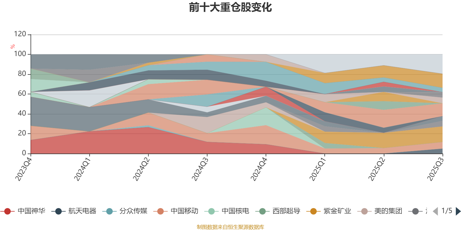 该基金持股集中度较高,近2年前十大重仓股集中度长期超过60%。截至2025年三季度末,基金十大重仓股分别是紫金矿业、宁波银行、招商银行、中国移动、铜陵有色、江西铜业、中航光电、航天电器、贵州茅台、长江电力。