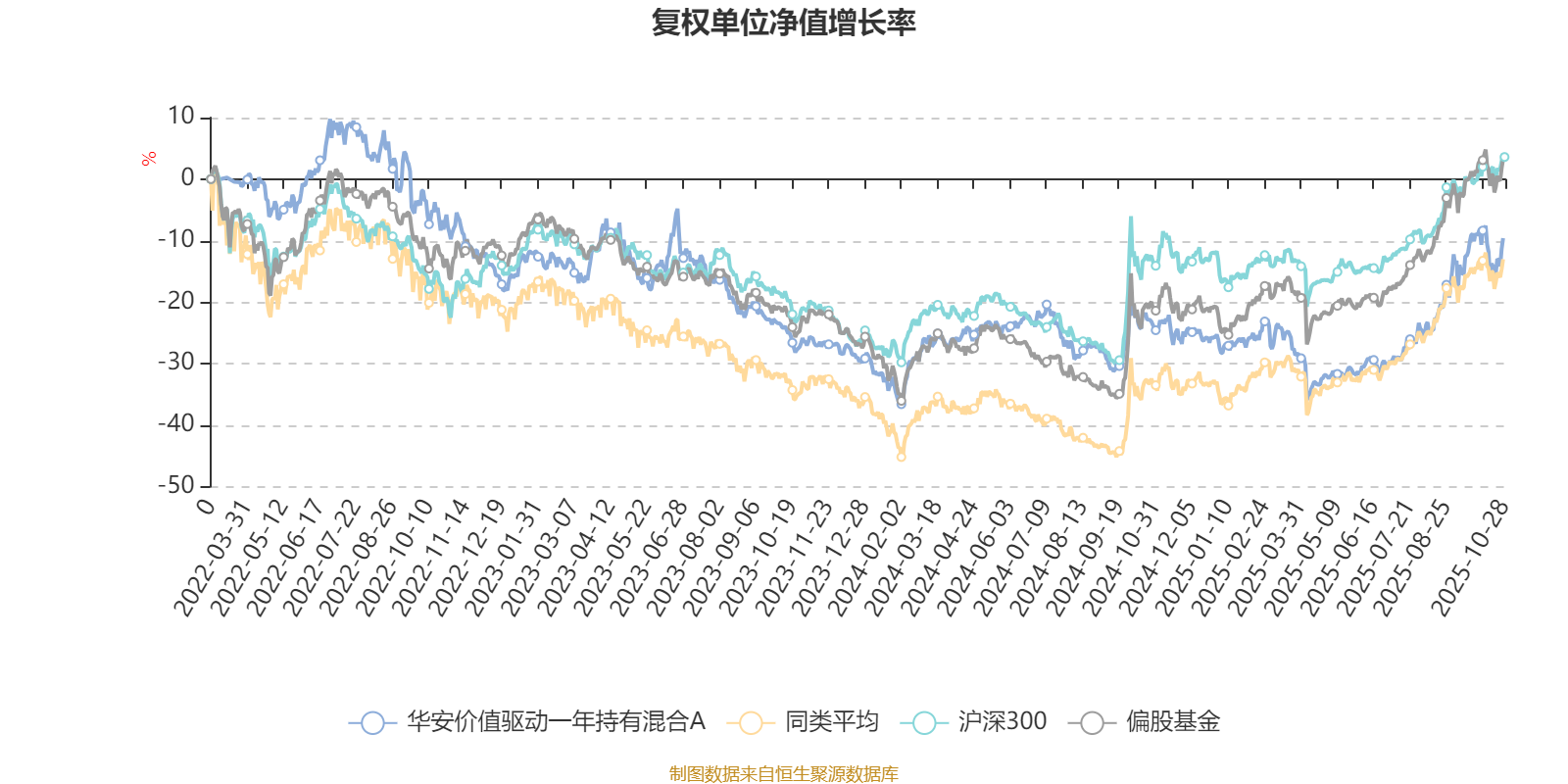 截至10月27日,华安价值驱动一年持有混合A近三个月复权单位净值增长率为23.48%,位于同类可比基金165/621;近半年复权单位净值增长率为33.13%,位于同类可比基金251/619;近一年复权单位净值增长率为17.26%,位于同类可比基金460/611;近三年复权单位净值增长率为-1.92%,位于同类可比基金421/518。
