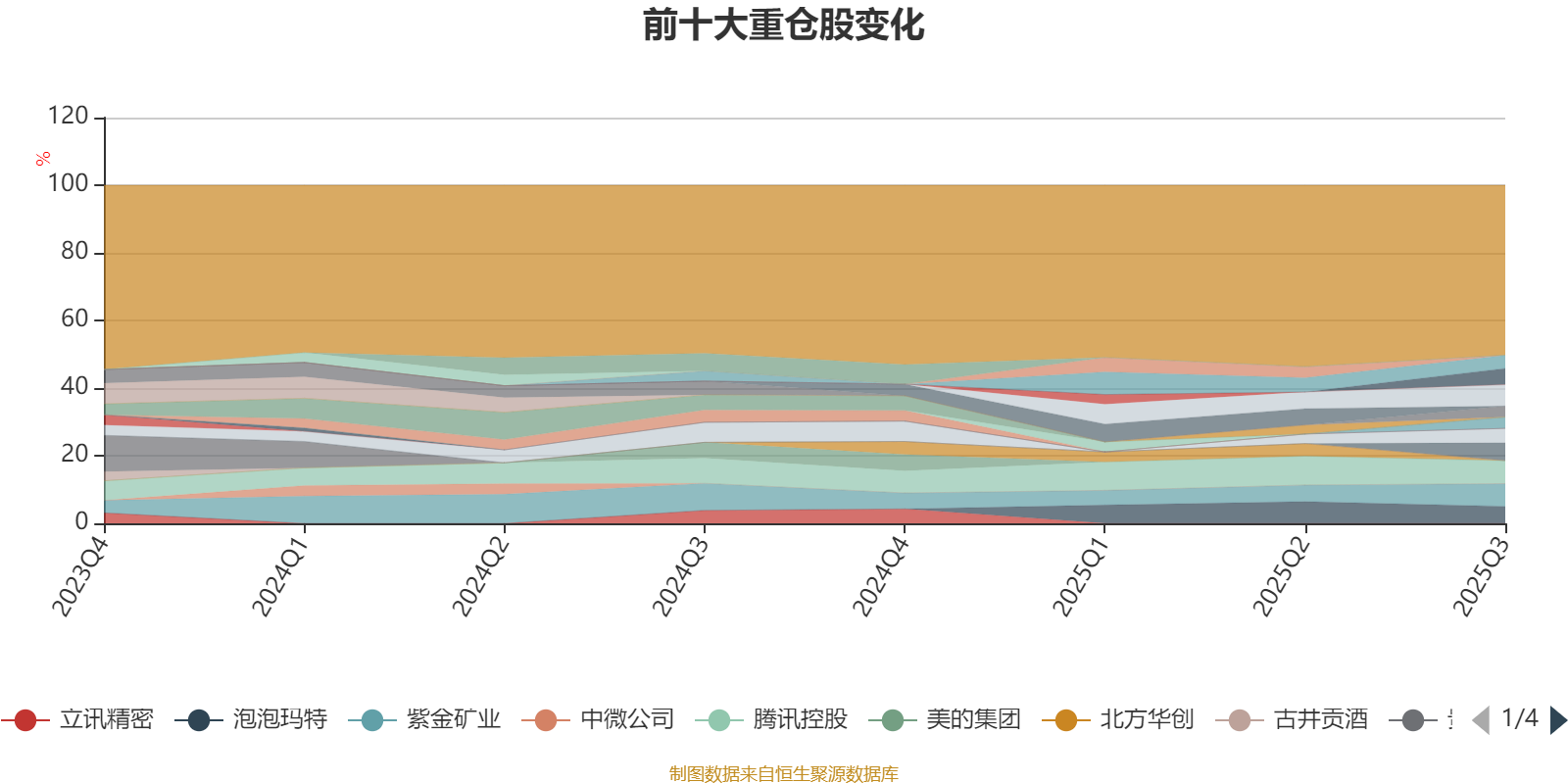 截至2025年三季度末,基金十大重仓股分别是腾讯控股、紫金矿业、中芯国际、ST华通、泡泡玛特、亿纬锂能、宁德时代、阿里巴巴-W、三生制药、恒瑞医药。