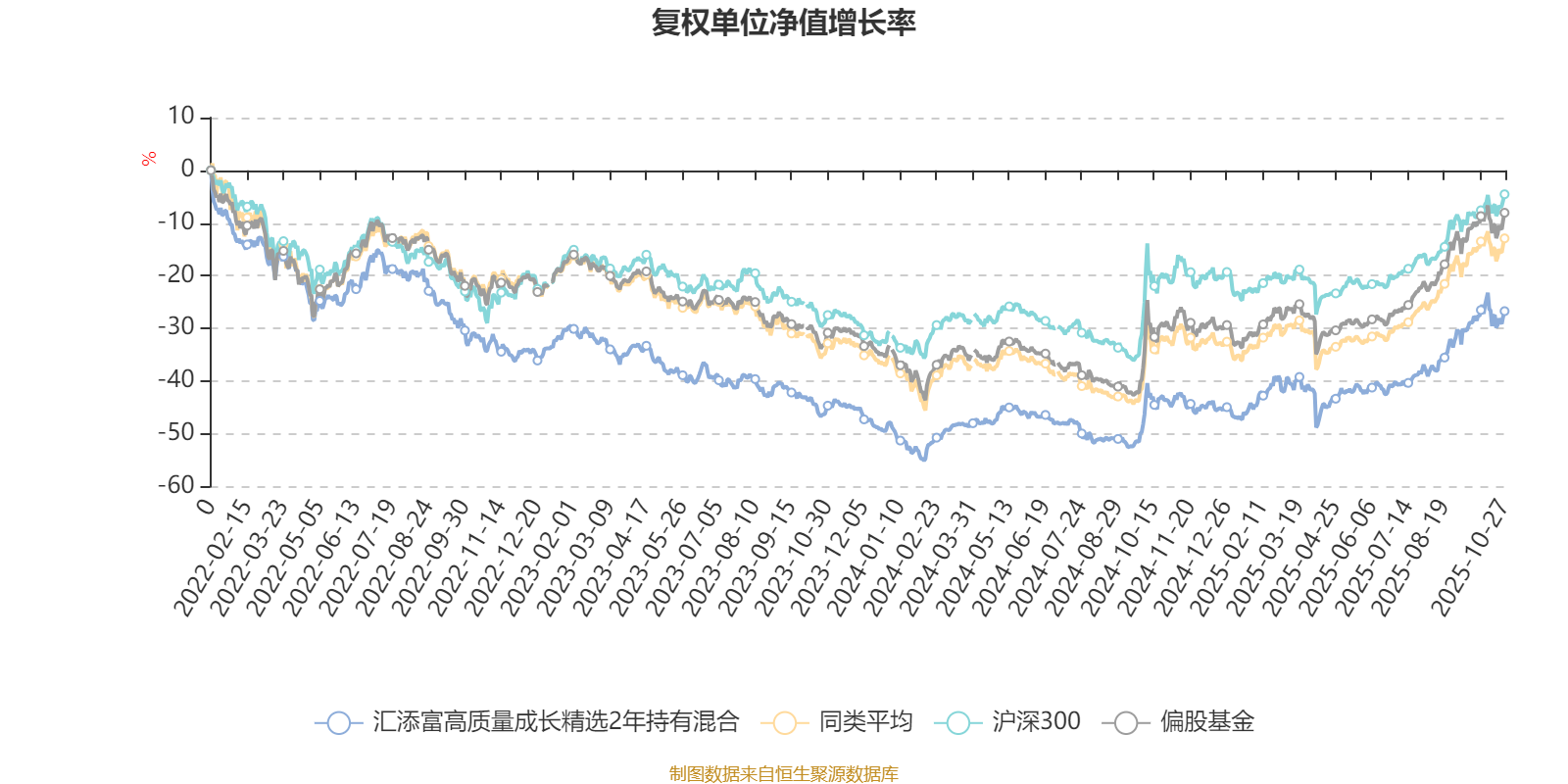 截至10月27日,汇添富高质量成长精选2年持有混合近三个月复权单位净值增长率为19.32%,位于同类可比基金65/185;近半年复权单位净值增长率为29.30%,位于同类可比基金93/185;近一年复权单位净值增长率为29.80%,位于同类可比基金83/181;近三年复权单位净值增长率为10.17%,位于同类可比基金121/175。