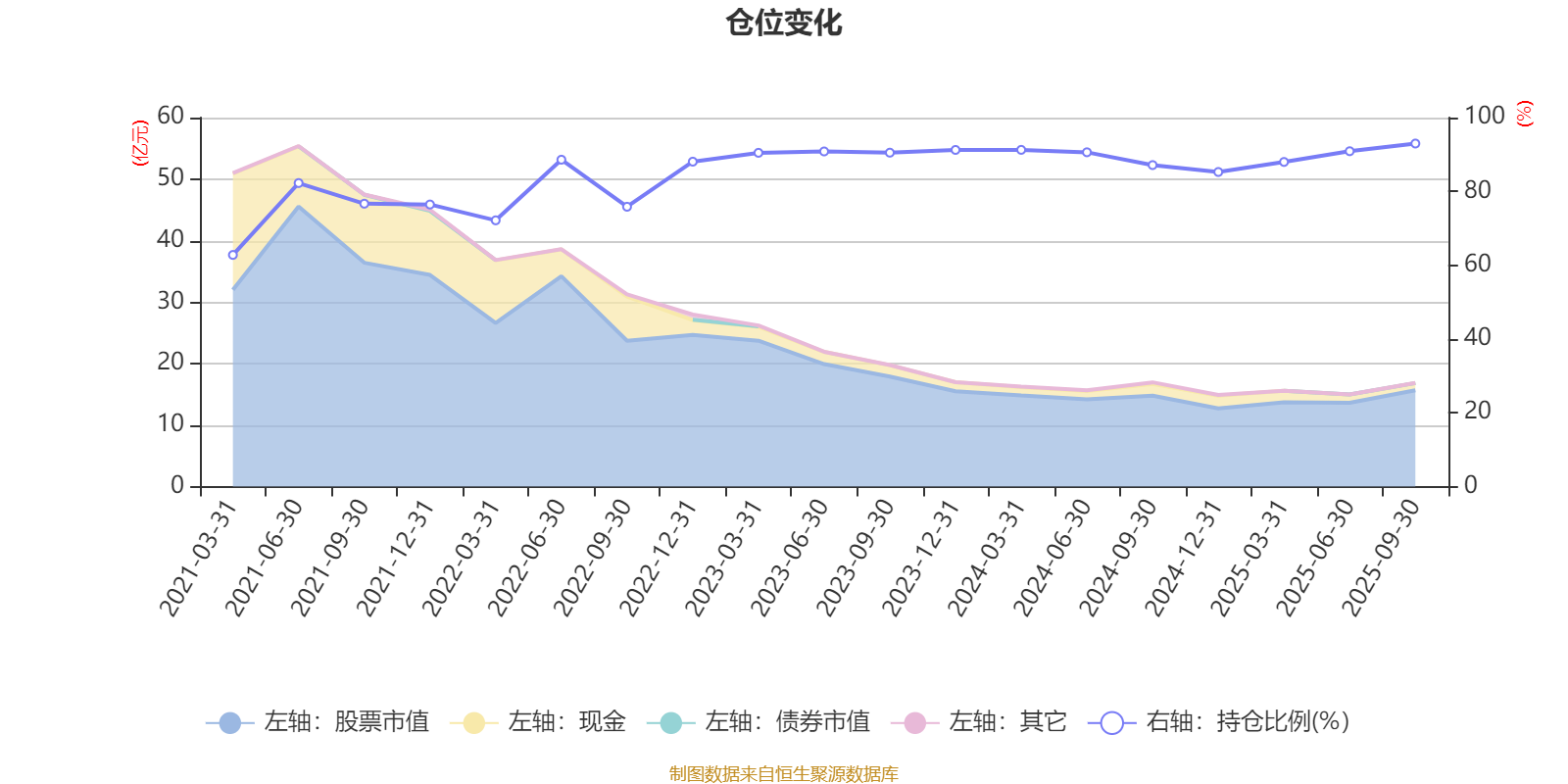 据定期报告数据统计,近三年平均股票仓位为89.77%,同类平均为87.62%。2025年三季度末基金达到92.97%的最高仓位,2021年一季度末最低,为62.78%。