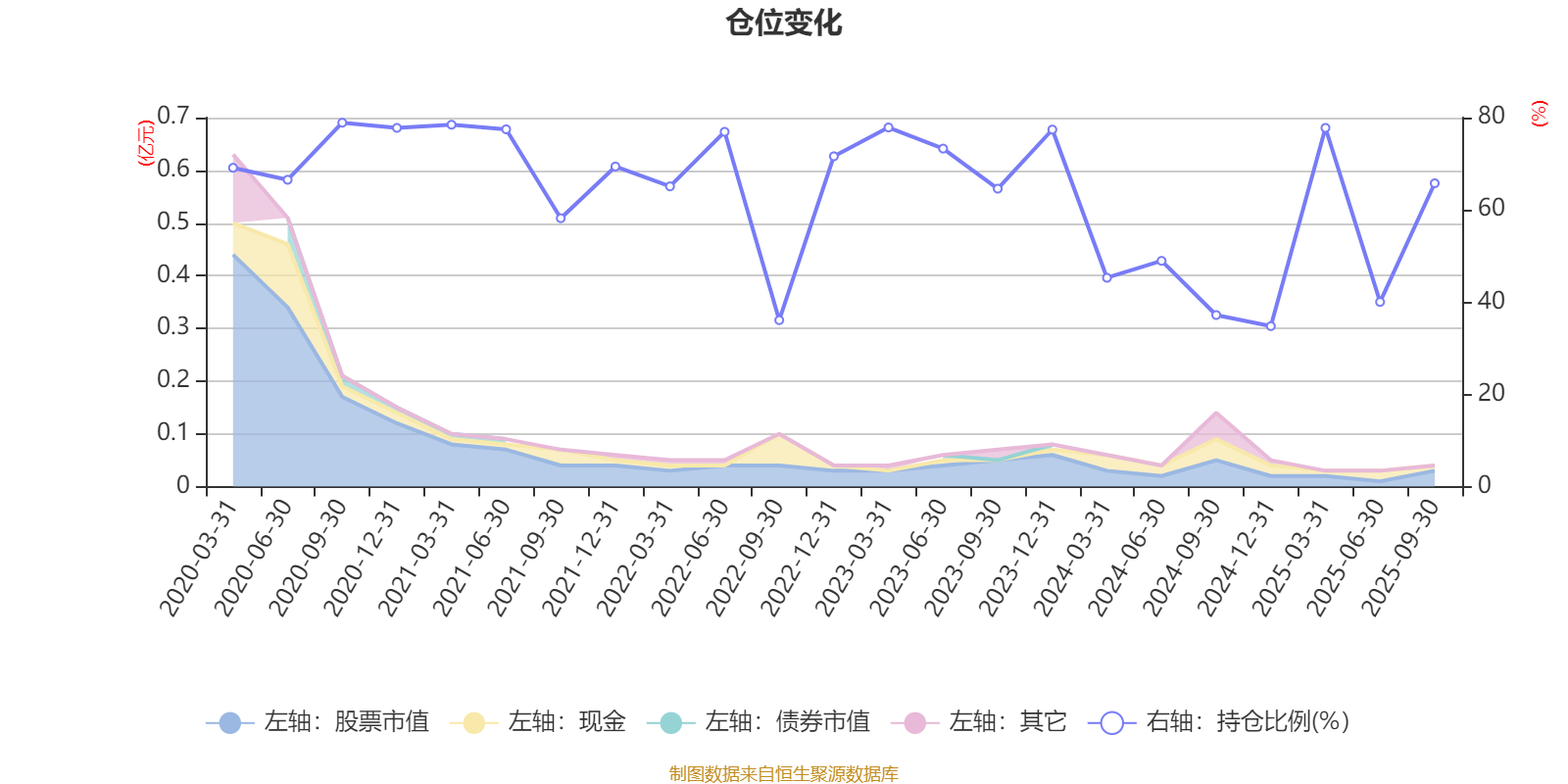 据定期报告数据统计,近三年平均股票仓位为59.54%,同类平均为72.35%。2020年三季度末基金达到78.89%的最高仓位,2024年末最低,为34.79%。