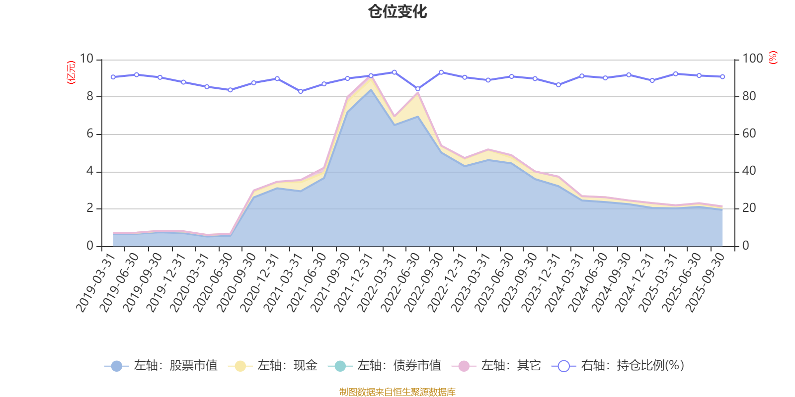 据定期报告数据统计,近三年平均股票仓位为90.28%,同类平均为72.35%。2022年一季度末基金达到93.21%的最高仓位,2021年一季度末最低,为82.97%。