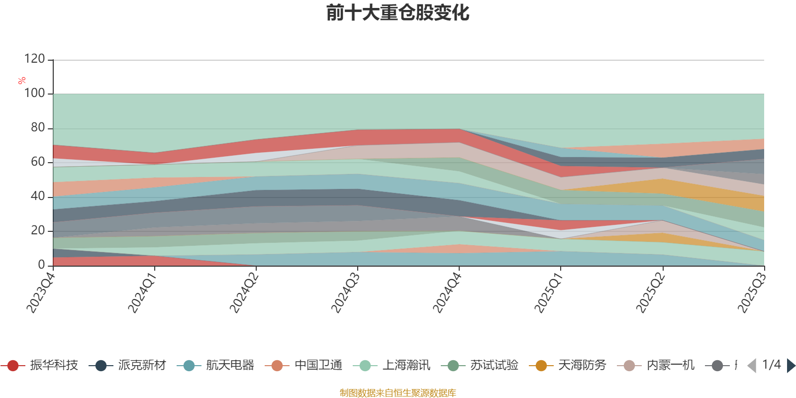 该基金持股集中度较高,近2年前十大重仓股集中度长期超过60%。截至2025年三季度末,基金十大重仓股分别是臻镭科技、航发科技、湘电股份、上海瀚讯、图南股份、中航西飞、西部材料、光威复材、航亚科技、中国海防。