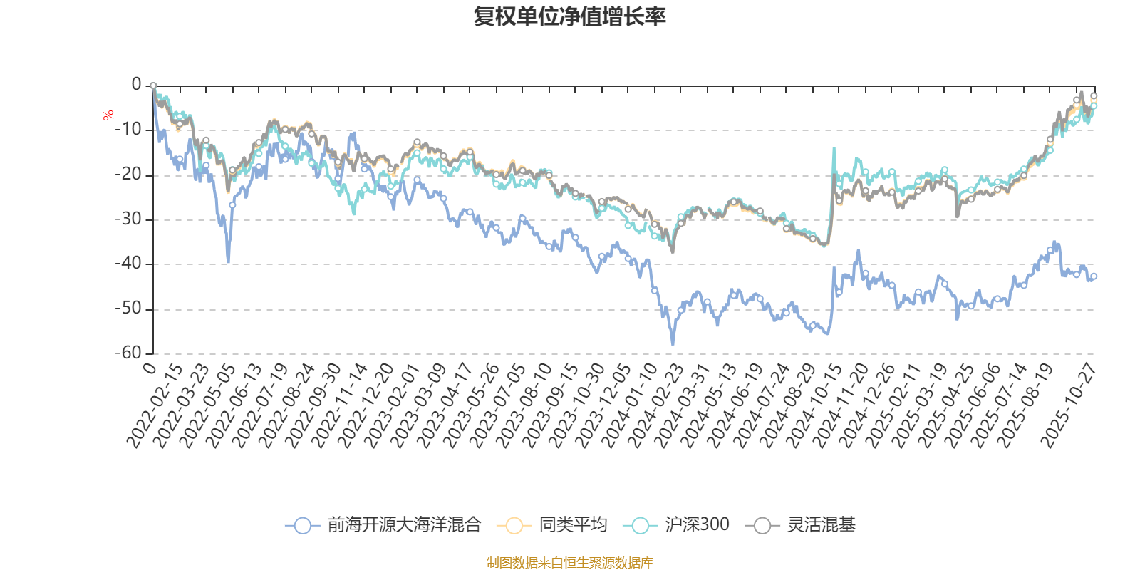 截至10月27日,前海开源大海洋混合近三个月复权单位净值增长率为-0.86%,位于同类可比基金1243/1287;近半年复权单位净值增长率为13.06%,位于同类可比基金954/1287;近一年复权单位净值增长率为0.31%,位于同类可比基金1239/1287;近三年复权单位净值增长率为-34.93%,位于同类可比基金1269/1286。