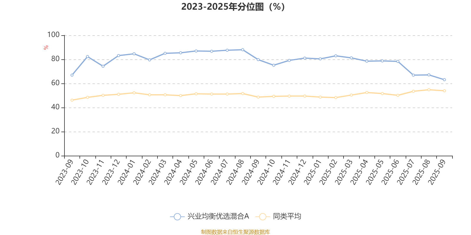 通过所选区间该基金净值增长率分位图,可以观察该基金与同类基金业绩比较情况。图为坐标原点到区间内某时点的净值增长率在同类基金中的分位数。