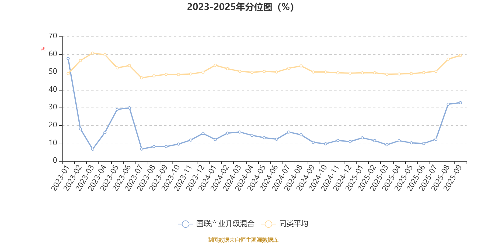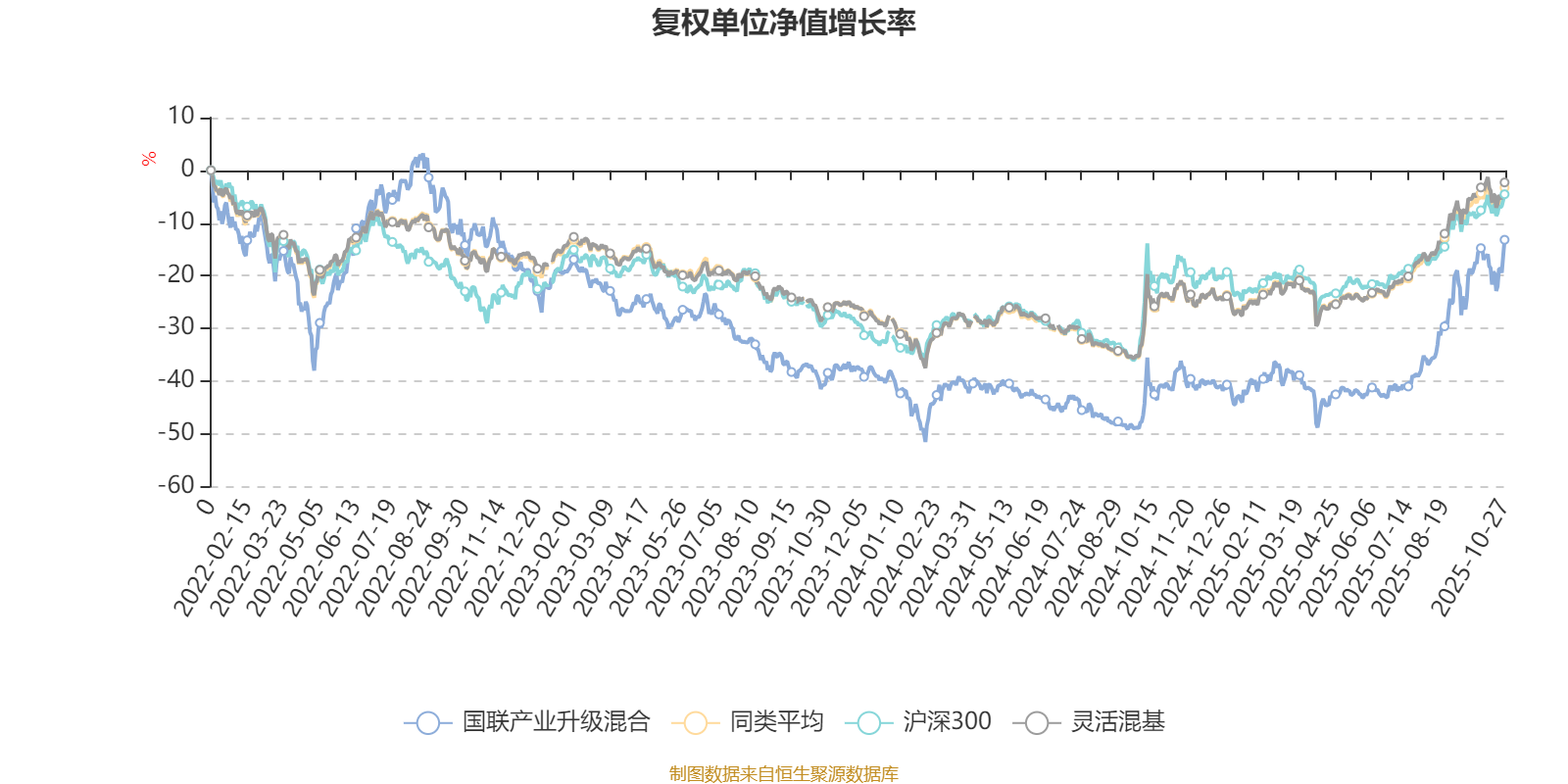 截至10月27日,国联产业升级混合近三个月复权单位净值增长率为40.09%,位于同类可比基金102/1287;近半年复权单位净值增长率为51.03%,位于同类可比基金154/1287;近一年复权单位净值增长率为45.99%,位于同类可比基金200/1287;近三年复权单位净值增长率为-0.49%,位于同类可比基金1002/1286。