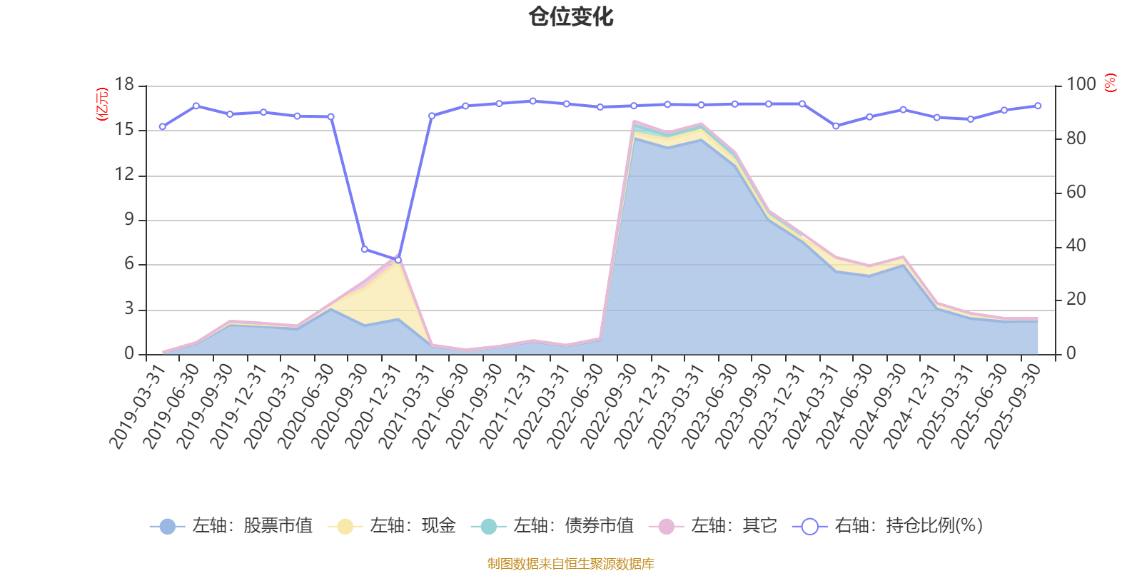 据定期报告数据统计,近三年平均股票仓位为90.75%,同类平均为72.35%。2021年末基金达到94.28%的最高仓位,2020年末最低,为35.08%。