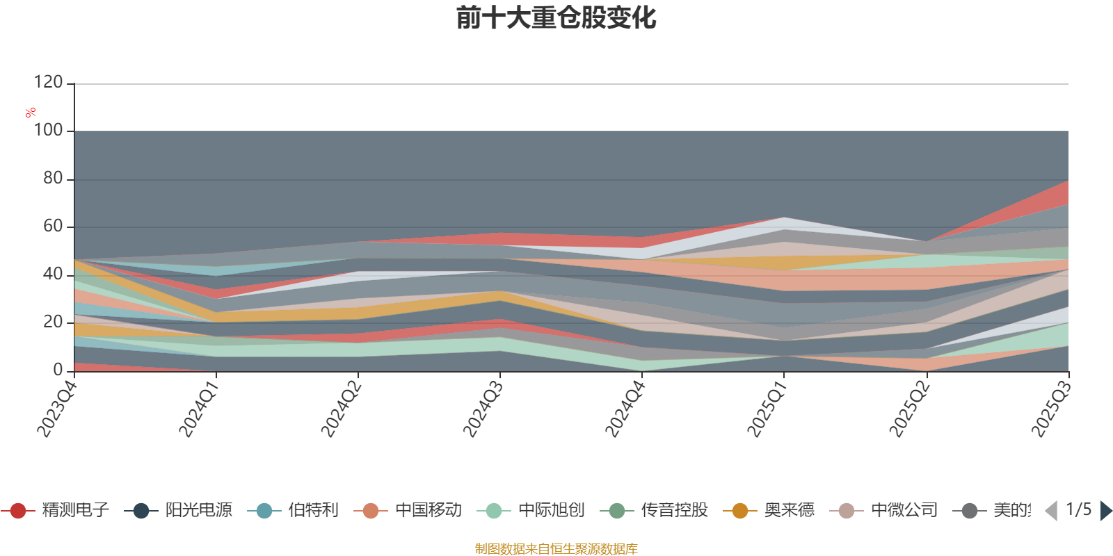 截至2025年三季度末,基金十大重仓股分别是阳光电源、新易盛、工业富联、中际旭创、寒武纪、亿纬锂能、宁德时代、ST华通、中科曙光、中芯国际。
