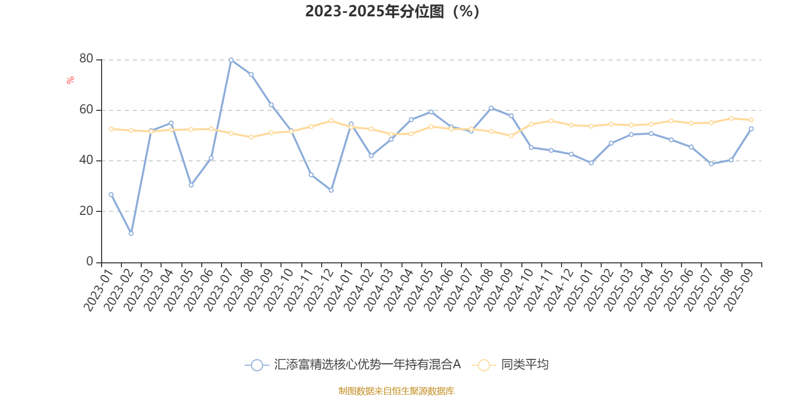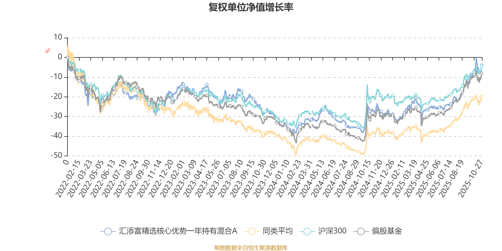 截至10月27日,汇添富精选核心优势一年持有混合A近三个月复权单位净值增长率为21.07%,位于同类可比基金197/621;近半年复权单位净值增长率为31.28%,位于同类可比基金276/619;近一年复权单位净值增长率为32.19%,位于同类可比基金274/611;近三年复权单位净值增长率为34.84%,位于同类可比基金133/518。
