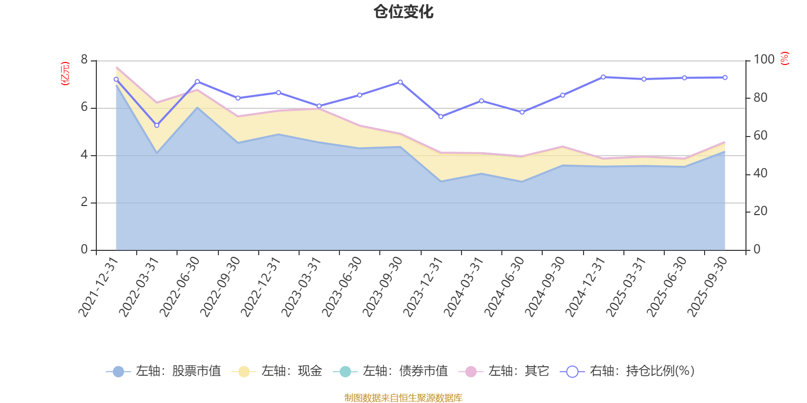 据定期报告数据统计,近三年平均股票仓位为83.02%,同类平均为85.66%。2024年末基金达到91.26%的最高仓位,2022年一季度末最低,为65.78%。