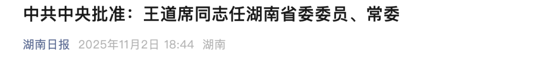 据湖南日报,近日,中共中央批准:王道席同志任湖南省委委员、常委。