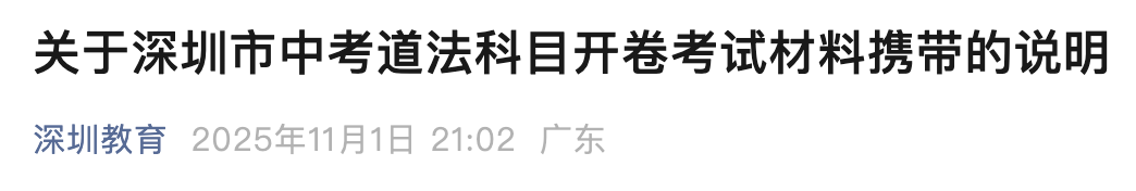 深圳市教育局11月1日发布“关于深圳市中考道法科目开卷考试材料携带的说明”,全文如下: