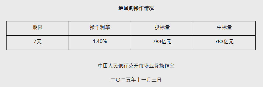 中新网11月3日电据央行网站消息,2025年11月3日中国人民银行以固定利率、数量招标方式开展了783亿元7天期逆回购操作。具体情况如下:
