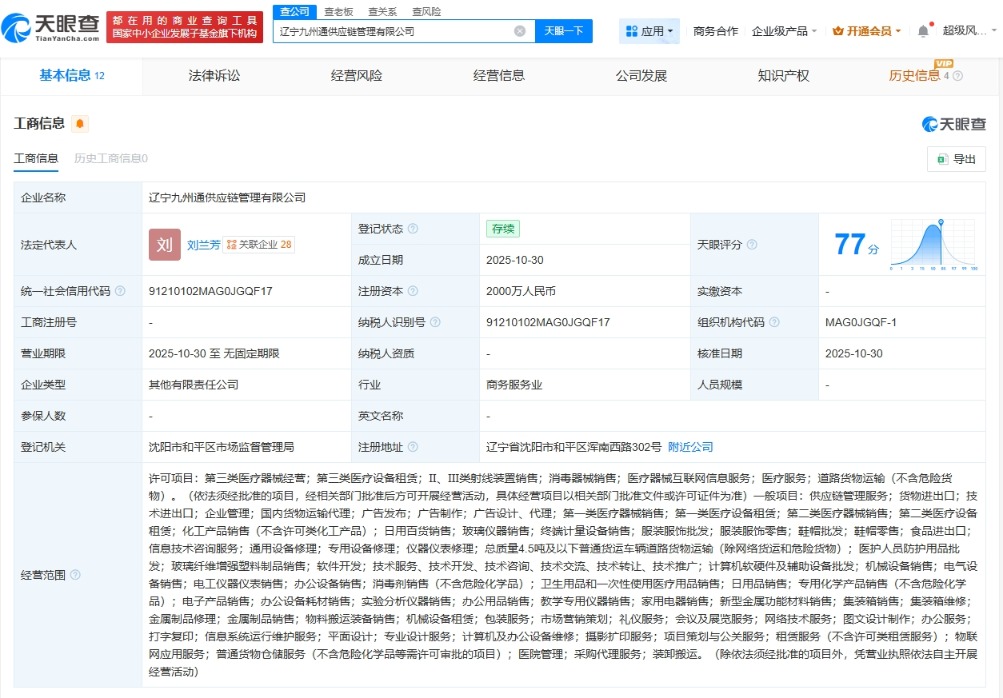每经AI快讯,天眼查App显示,近日,辽宁九州通供应链管理有限公司成立,法定代表人为刘兰芳,注册资本2000万元人民币,经营范围包括供应链管理服务、货物进出口、第三类医疗器械经营等。股东信息显示,该公司由九州通医疗器械集团有限公司、沈阳越荣鑫科技服务有限公司共同持股。