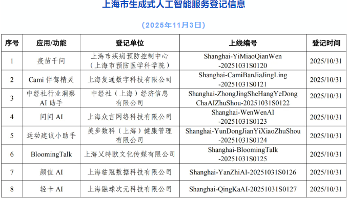 人民财讯11月3日电,据“网信上海”公众号消息,截至10月31日,上海市新增8款已完成登记的生成式人工智能服务,累计已完成127款生成式人工智能服务登记。