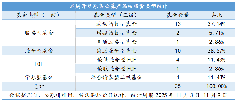 具体来看,股票型基金本周发行力度强劲,合计发行16 只,占全市场发行总量的45.71%。其中,被动指数型基金发行13只,占比37.14%,凭借清晰的跟踪方向与较低的管理费率,成为本周新基发行的“绝对主力”;增强指数型基金发行2只,占比5.71%,这类产品在指数跟踪基础上叠加主动管理策略,旨在获取超额收益,满足投资者对“指数+增强” 的差异化需求;普通股票型基金发行1只,占比 2.86%。