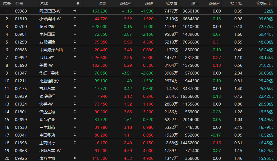 盘面上,大型科技股涨跌各异,小米涨3.5%,百度、美团飘红,阿里巴巴跌超1%;欧佩克+拟明年Q1暂停增产,大摩上调短期油价预期,三桶油全天强势,中国石油股份涨超3%刷新阶段新高;煤炭季节性消费旺季正式拉开序幕,煤炭股集体活跃;内银股、保险股、新能源汽车股、航空股、风电股、生物医药股集体上涨。另一方面,黄金交易税收政策调整,黄金股、珠宝首饰股跌幅最为明显,明星股老铺黄金大跌超7%,中国黄金国际、紫金黄金国际均下跌;半导体股继续弱势,苹果概念股、家电股、零售股普遍下跌。