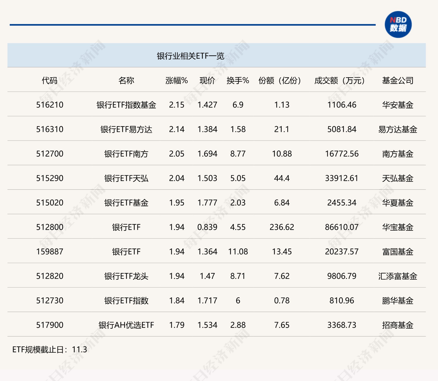 行业ETF风向标丨ETF交易显著缩量 4只银行ETF半日涨幅超2%