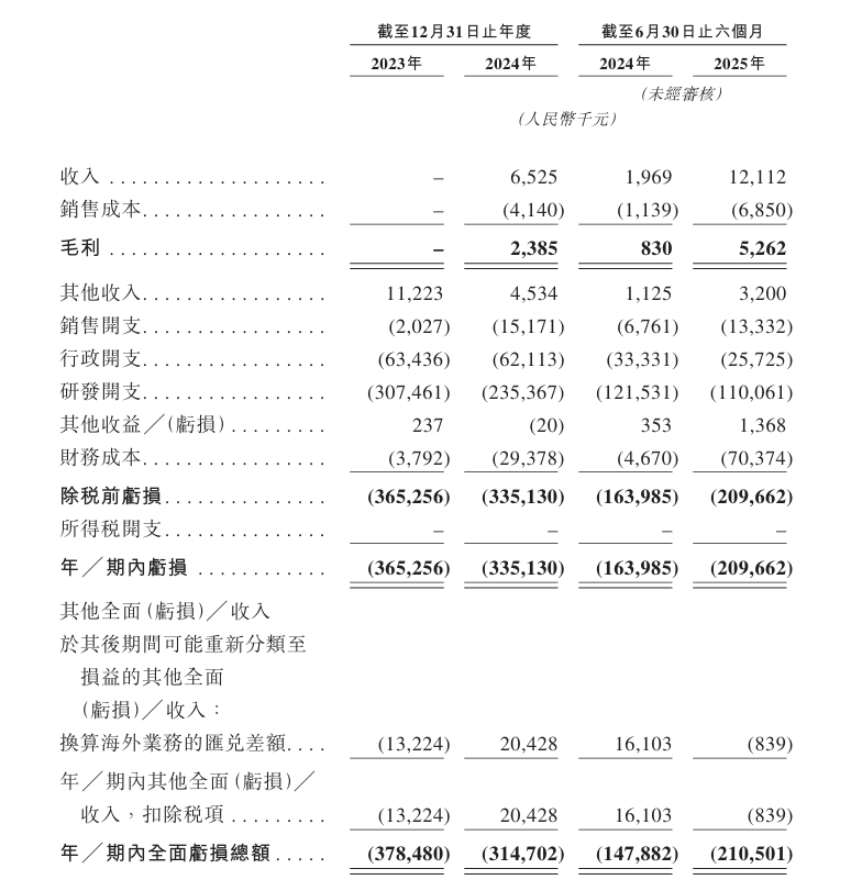 2024年上半年、2024年以及2025年上半年,公司分别实现营业收入约196.9万元、652.5万元、1211.2万元。2023年、2024年上半年、2024年以及2025年上半年,净利润分别为亏损3.65亿元、亏损1.64亿元、亏损3.35亿元、亏损2.10亿元。