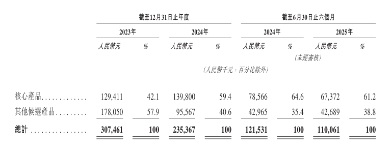 2023年、2024年上半年、2024年以及2025年上半年,公司研发开支分别约为3.07亿元、1.22亿元、2.35亿元、1.1亿元,其中核心产品应占研发开支分别约为1.29亿元、0.79亿元、1.4亿元、0.67亿元,分别占研发开支的42.1%、64.6%、59.4%、61.2%。
