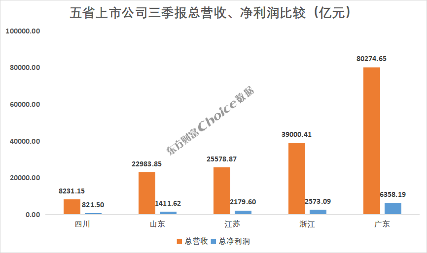 从上市公司2025年三季报营收和净利润来看,广东887家A股上市公司共实现营业收入8.03万亿元,实现归母净利润6358.19亿元;浙江728家上市公司共实现营业收入3.9万亿元,实现归母净利润2573.09亿元;江苏713家上市公司共实现营业收入2.56万亿元,实现归母净利润2179.6亿元;山东310家上市公司实现营业收入2.3万亿元,实现归母净利润1411.62亿元;四川179家上市公司实现营业收入8231.15亿元,实现归母净利润821.5亿元。