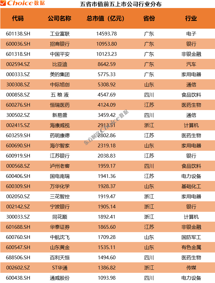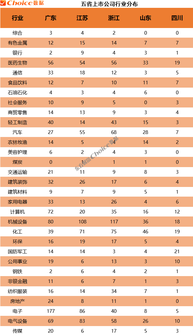 行业分布上,广东上市公司集中在电子、机械设备、计算机等行业,江苏、浙江、山东则集中在医药生物、机械设备、汽车、化工等行业,四川集中在国防军工、医药生物等行业。广东在电子、计算机、通信、房地产行业的上市公司数量明显占优;而江苏、浙江在机械设备、汽车、化工行业的上市公司数量占优;四川的优势在国防军工行业。