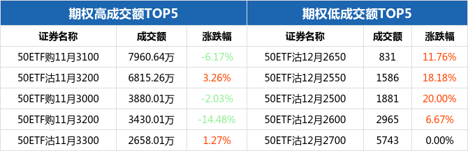 从成交额来看,50ETF期权合约中,50ETF购11月3100成交额最高,为7960.64万元,全日下跌6.17%,报收0.0745元;而最低的为50ETF沽12月2650,成交额为831元,全日上涨11.76%,报收0.0019元。
