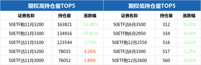 从持仓量来看,50ETF期权合约中,50ETF购11月3200持仓量最大,为163821张,期权全日下跌14.48%,报收0.0248元;持仓量最小的为50ETF沽6月3500,共计312张,期权全日下跌0.30%,报收0.395元。