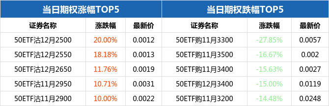 上证上证50ETF收跌,50ETF沽12月2500涨幅20.00%