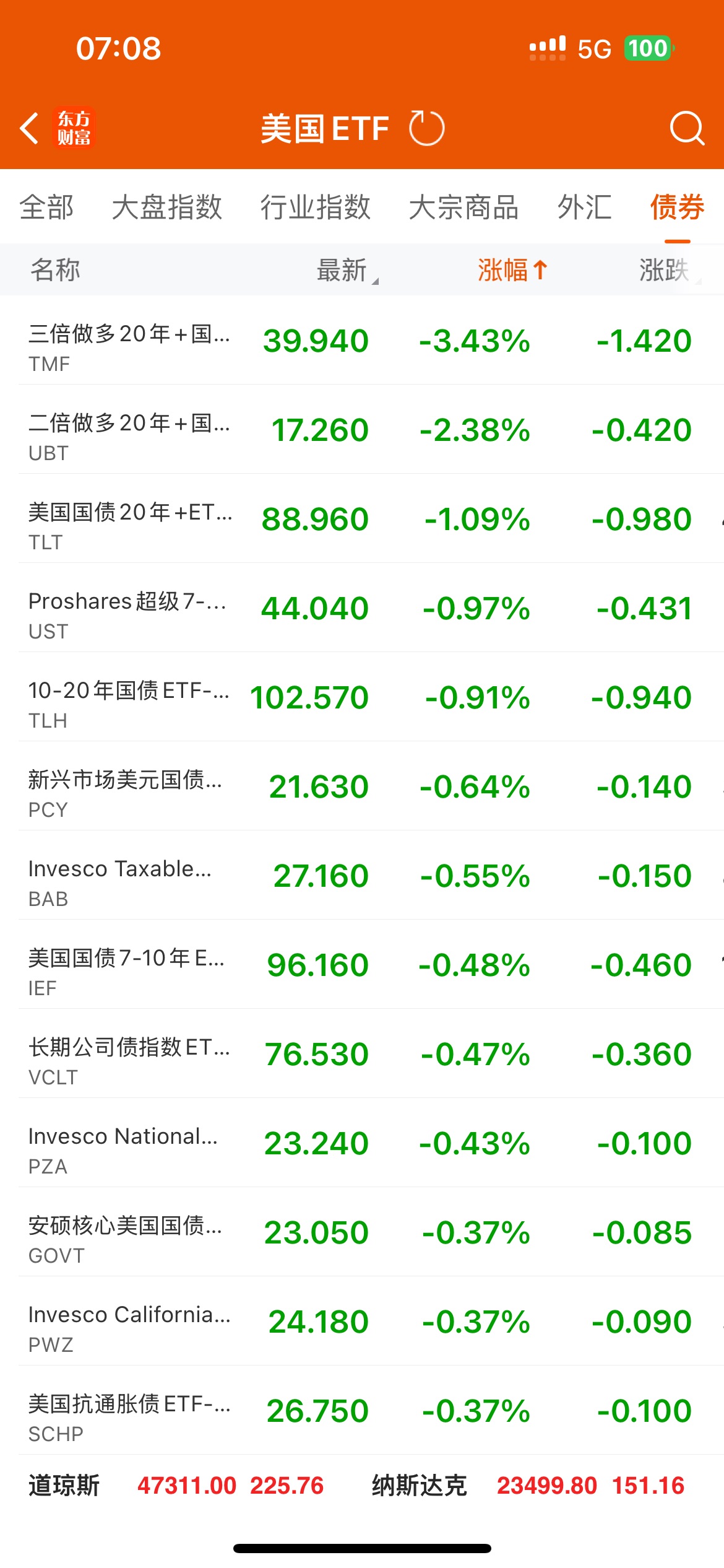 三倍做多20年期以上国债ETF-Direxion(TMF.US) 跌3.43%,成交额3.07亿美元。
