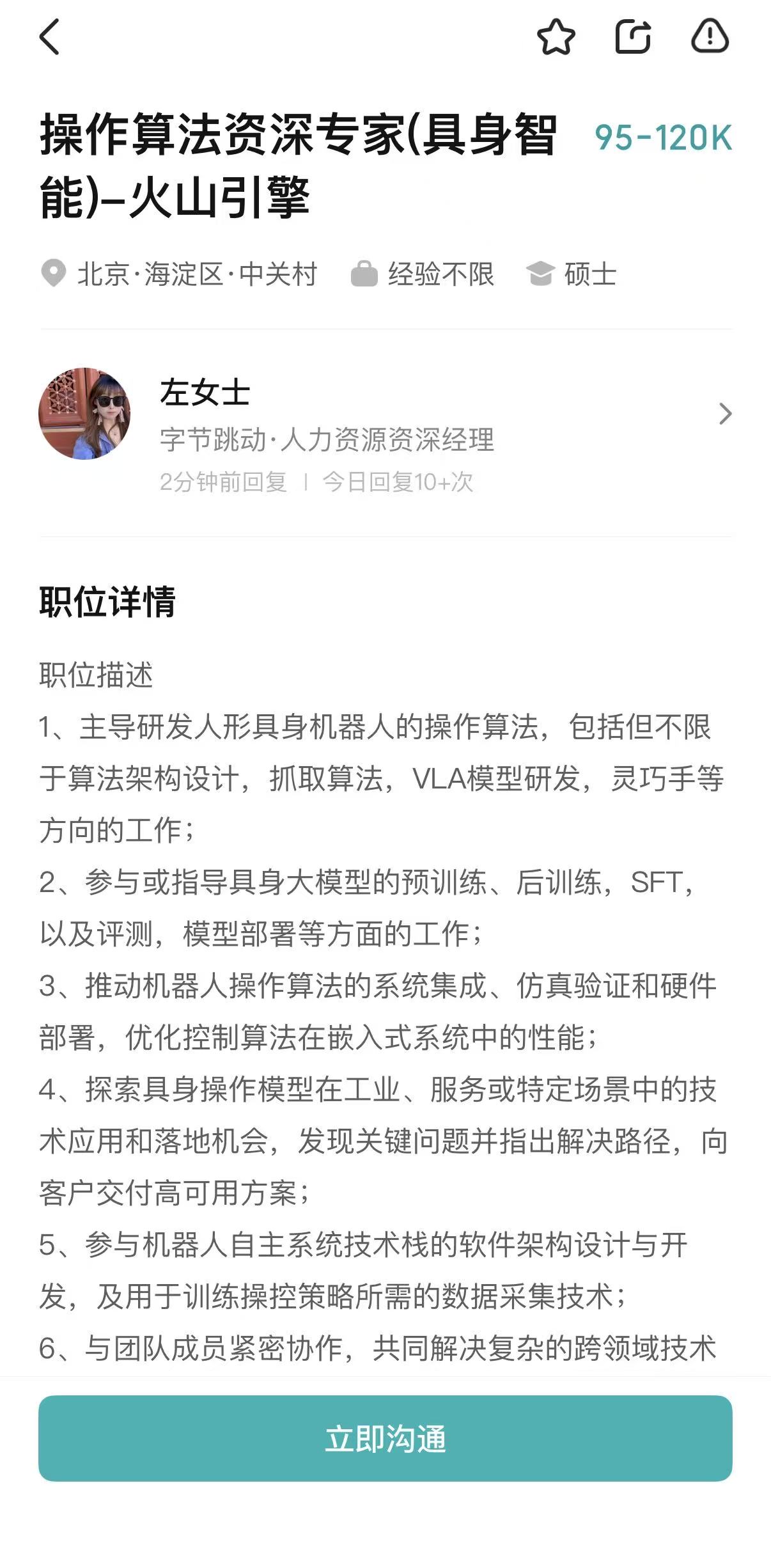 《科创板日报》11月5日讯(记者张洋洋)字节跳动旗下火山引擎业务启动了一项高规格招聘,操作算法资深专家(具身智能),该岗位月薪高达95-120K(月薪9.5万-12万)。