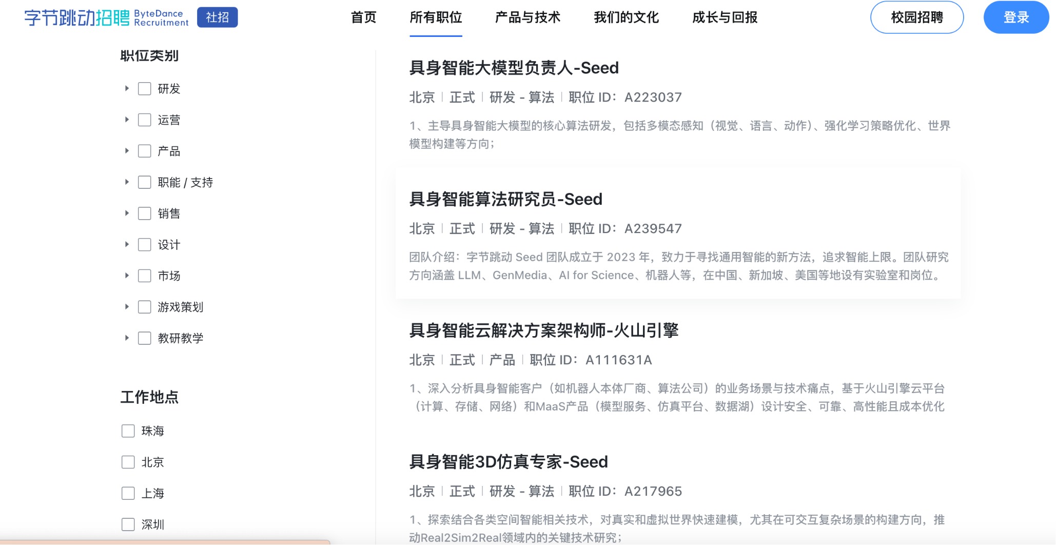 不过在字节跳动官网,已上线多个相关岗位,包括“具身智能大模型负责人”“3D仿真专家”“机器人算法研究员”等。