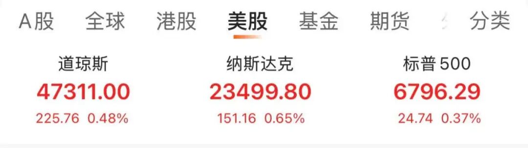 在经历了“黑色星期二”后,美股三大指数5日集体收涨。截至收盘,道指涨225.76点,收于47311.00点,涨幅为0.48%;标普500指数涨24.74点,收于6796.29点,涨幅为0.37%;纳指涨151.16点,收于23499.80点,涨幅为0.65%。美国总统特朗普表示,政府停摆影响了股市,但仍预计市场将创新高。“我们必须尽快让政府重新开门,现在已经对股市造成了一点影响。”