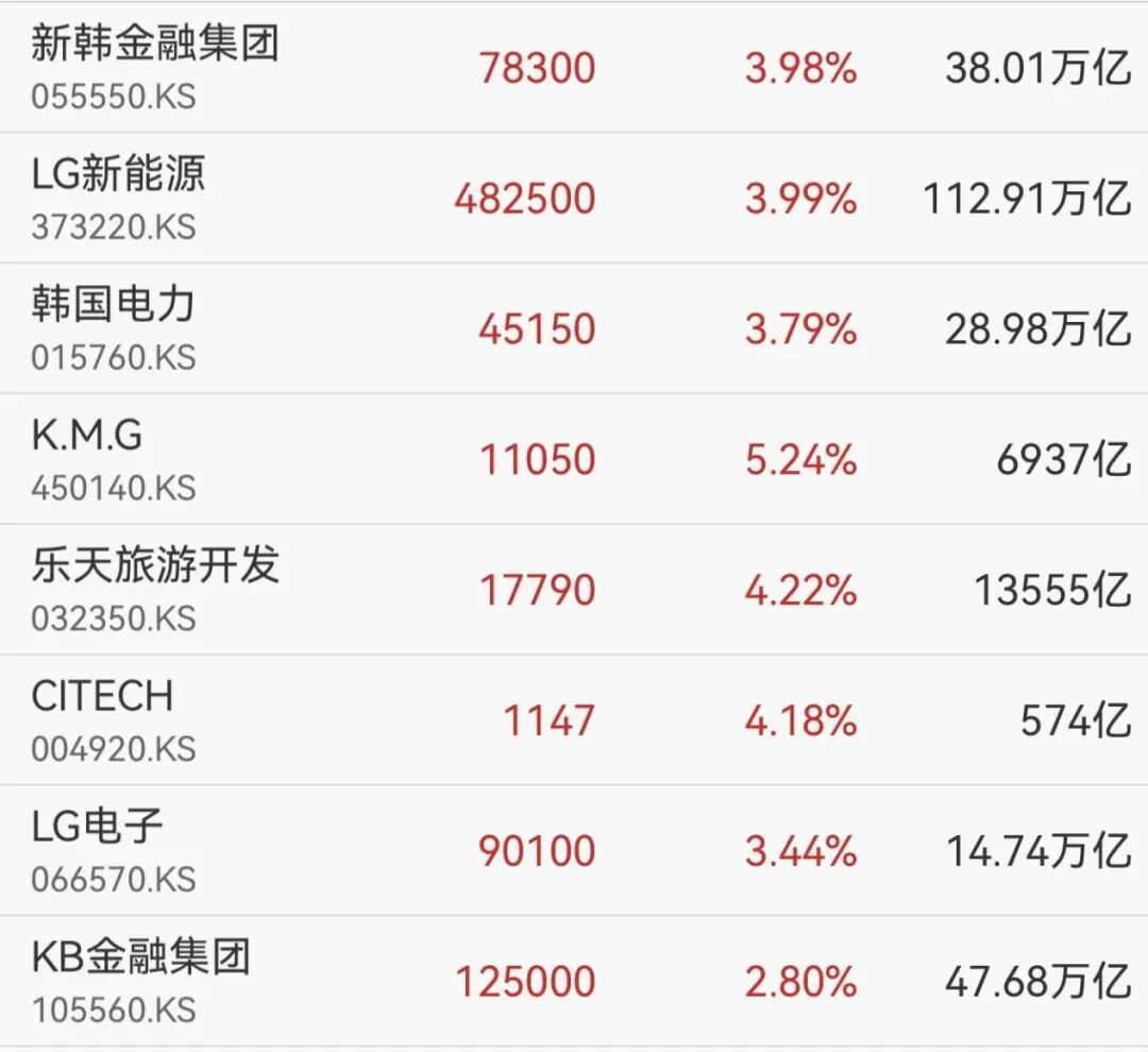 个股方面,LG新能源、韩国电力、LG电子等涨幅居前。