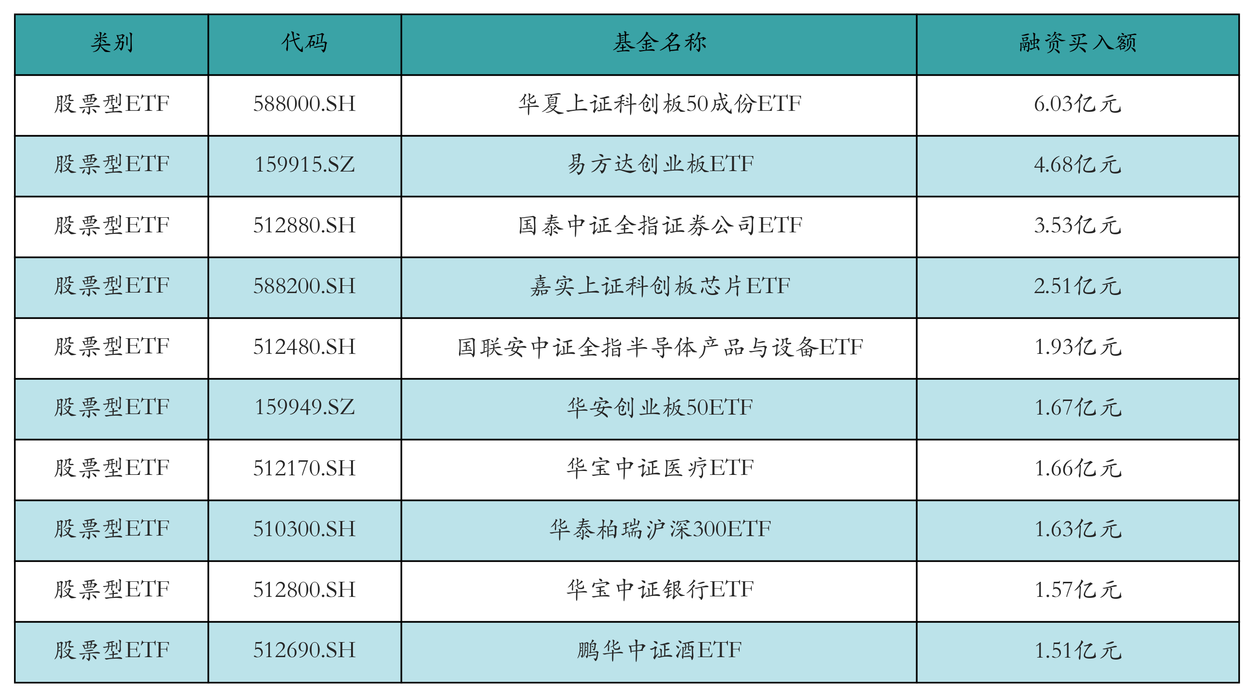 昨日股票型ETF融资买入额最高的3只ETF及其买入金额分别为:华夏上证科创板50成份ETF(6.03亿元)、易方达创业板ETF(4.68亿元)、国泰中证全指证券公司ETF(3.53亿元)。融资买入额前10详情见下表: