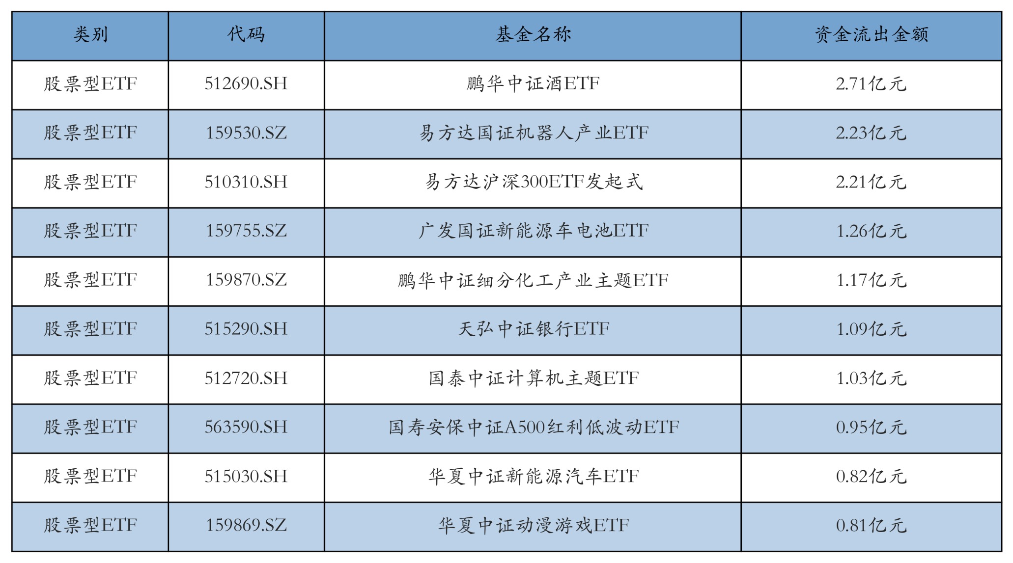 昨日股票型ETF资金流出最多的3只ETF及其流出金额分别为:鹏华中证酒ETF(流出2.71亿元)、易方达国证机器人产业ETF(流出2.23亿元)、易方达沪深300ETF发起式(流出2.21亿元)。资金流出前10详情见下表: