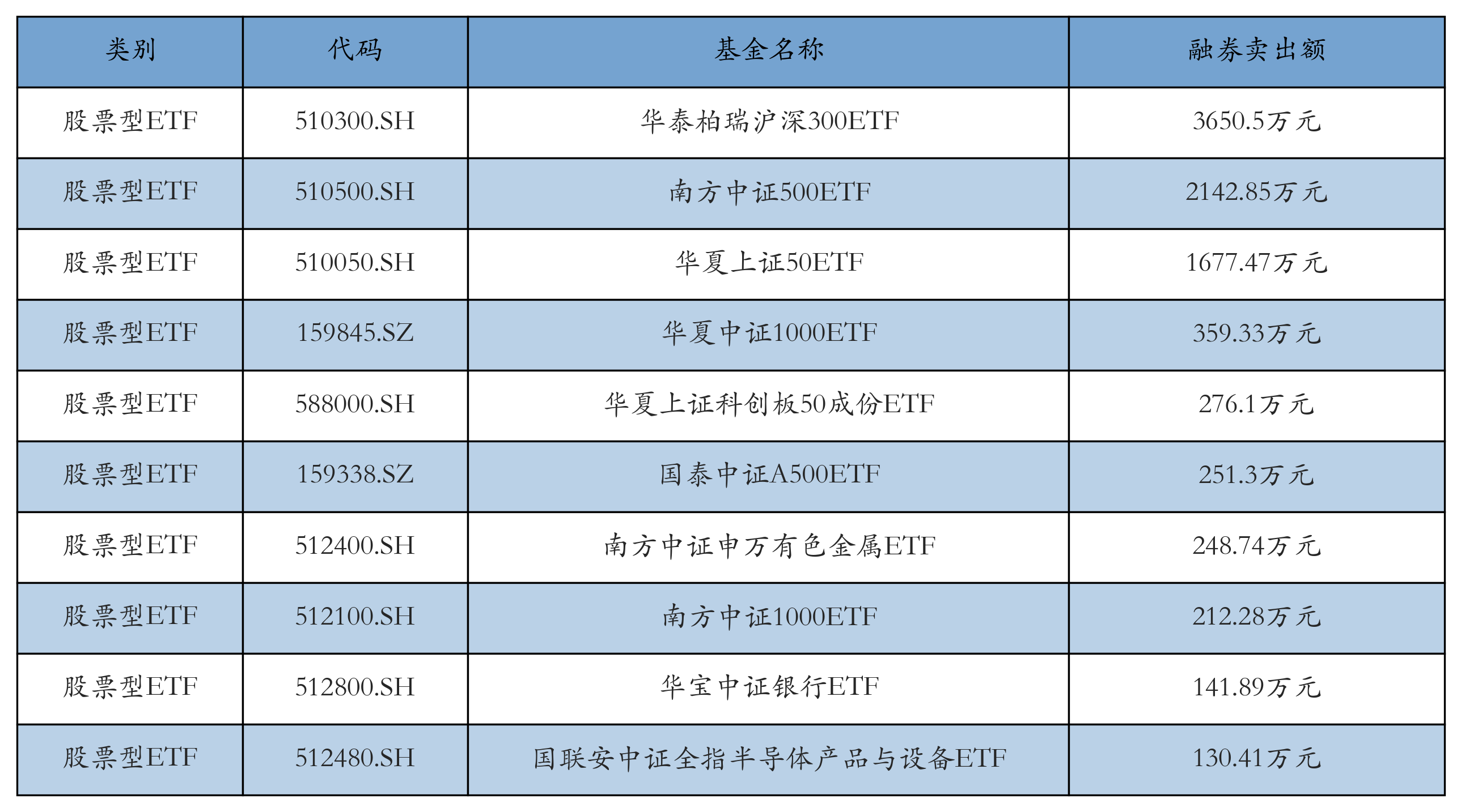 昨日股票型ETF融资卖出额最高的3只ETF及其卖出金额分别为:华泰柏瑞沪深300ETF(3650.5万元)、南方中证500ETF(2142.85万元)、华夏上证50ETF(1677.47万元)。融券卖出额前10详情见下表: