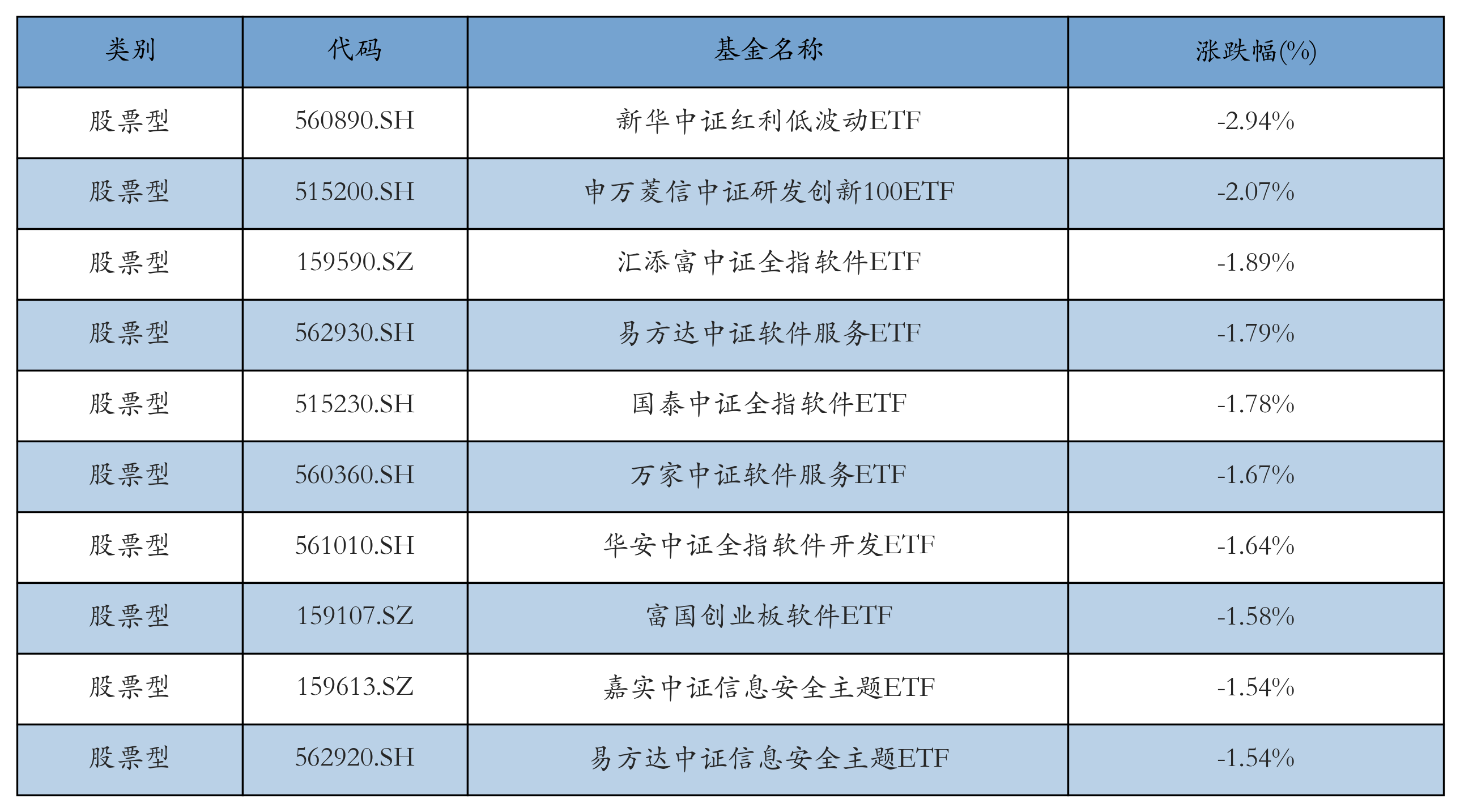 昨日股票型ETF跌幅最大的3只ETF及其收益率分别为:新华中证红利低波动ETF(-2.94%)、申万菱信中证研发创新100ETF(-2.07%)、汇添富中证全指软件ETF(-1.89%)。跌幅前10详情见下表: