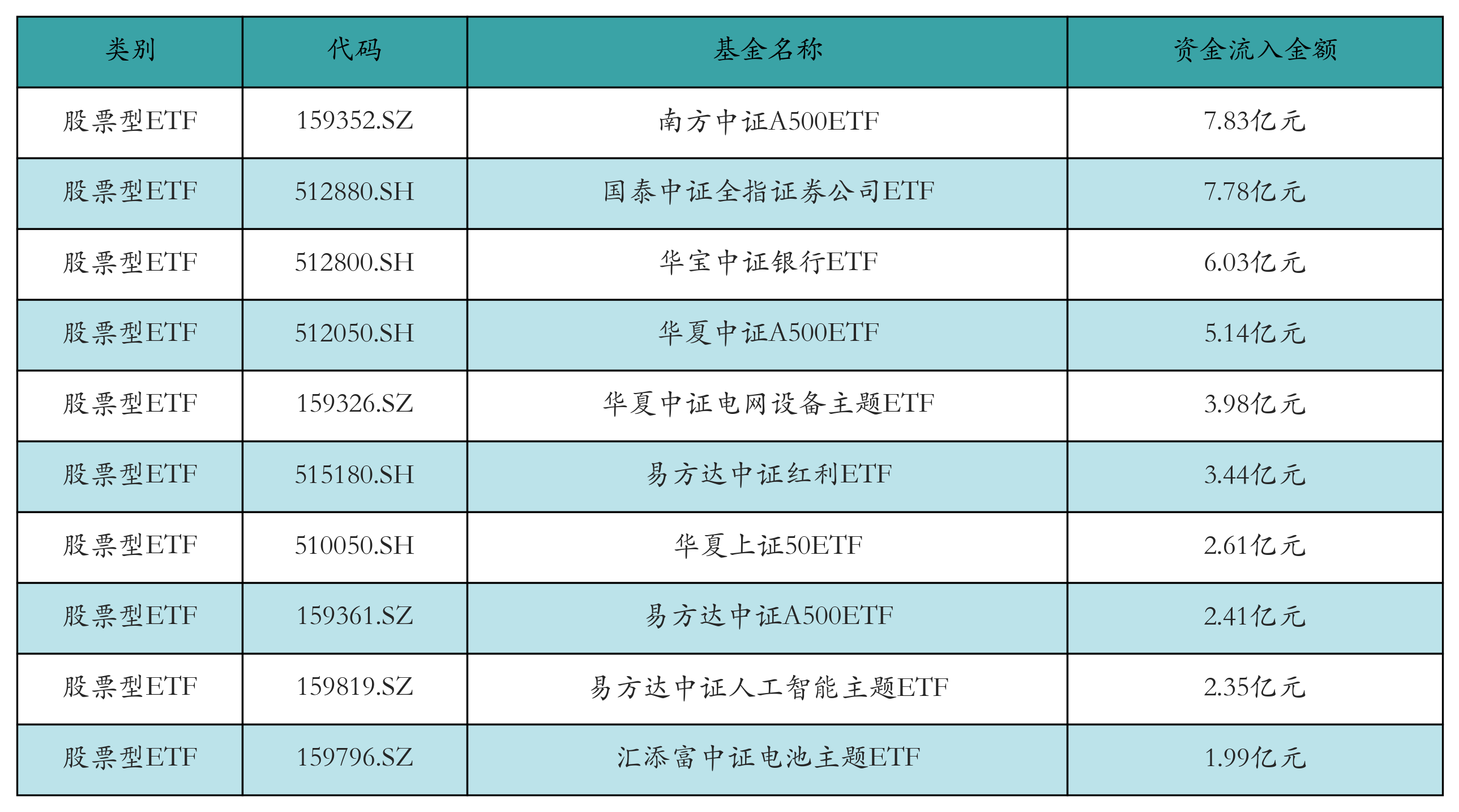 昨日股票型ETF资金流入最多的3只ETF及其流入金额分别为:南方中证A500ETF(流入7.83亿元)、国泰中证全指证券公司ETF(流入7.78亿元)、华宝中证银行ETF(流入6.03亿元)。资金流入前10详情见下表: