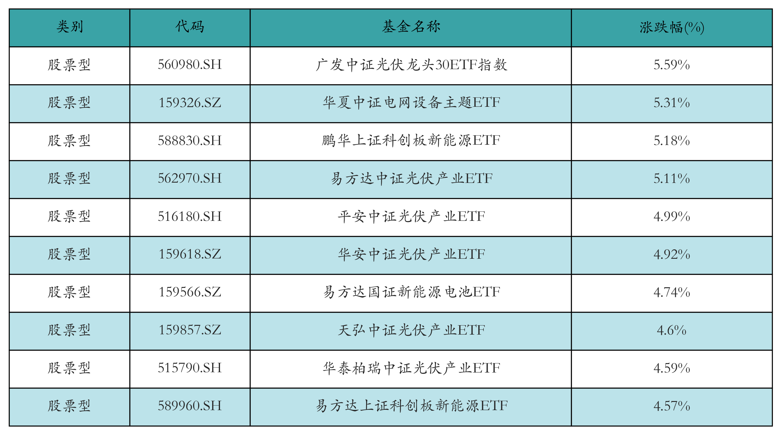 昨日股票型ETF涨幅最高的3只ETF及其收益率分别为:广发中证光伏龙头30ETF指数(5.59%)、华夏中证电网设备主题ETF(5.31%)、鹏华上证科创板新能源ETF(5.18%)。涨幅前10详情见下表: