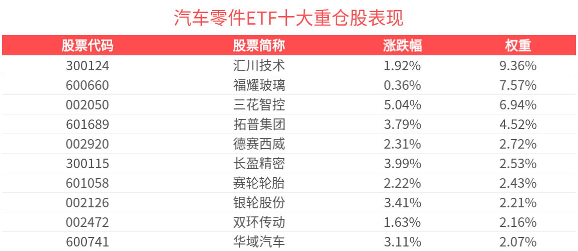 汽车零件ETF紧密跟踪中证汽车零部件主题指数,机器人含量高,受相关催化涨超2.0%。