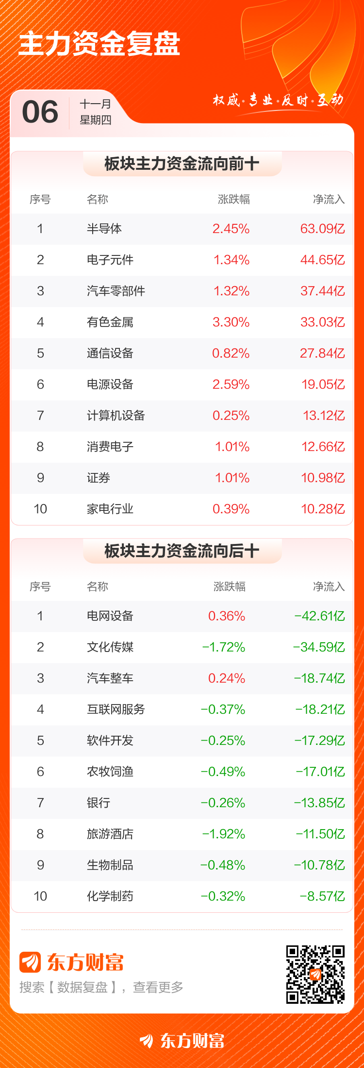 11月6日,沪指涨0.97%,深成指涨1.73%,创业板指涨1.84%。两市成交额2.06万亿,较上个交易日放量1829亿。数据显示,今日大盘主力资金净流入11.65亿。半导体、电子元件、汽车零部件等板块主力资金流入排名居前,其中半导体净流入63.09亿元。