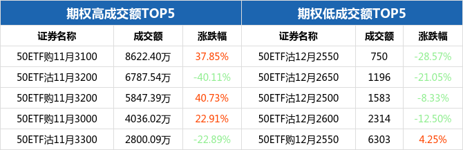 从成交额来看,50ETF期权合约中,50ETF购11月3100成交额最高,为8622.4万元,全日上涨37.85%,报收0.1027元;而最低的为50ETF沽12月2550,成交额为750元,全日下跌28.57%,报收0.001元。