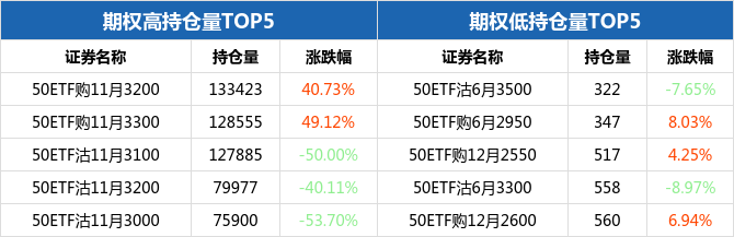 50ETF期权当日有100个合约正在交易。从涨跌幅来看,50ETF期权合约中,50ETF购11月3300涨幅最大,为49.12%,报收0.0085元;50ETF沽11月3000跌幅最大,为53.70%,报收0.0025元。