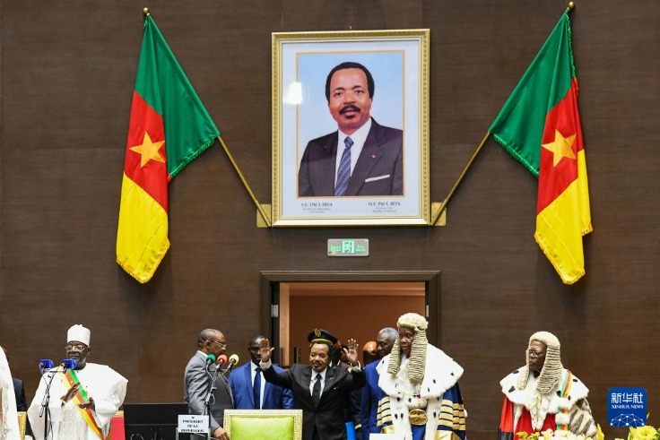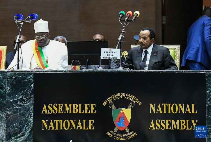 11月6日,在喀麦隆首都雅温得,喀麦隆总统保罗·比亚(中)在宣誓就职后发表讲话。新华社发(科普索摄)