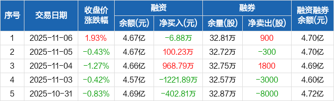 融资方面,当日融资买入2313.98万元,融资偿还2320.87万元,融资净偿还6.88万元。融券方面,融券卖出1200股,融券偿还300股,融券余量32.81万股,融券余额311.7万元。融资融券余额合计4.7亿元。
